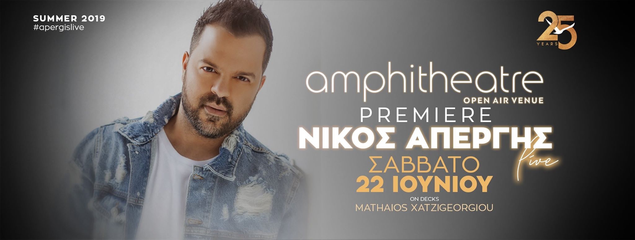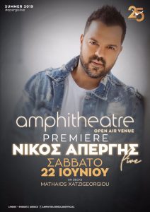 Το Σάββατο 22 Ιουνίου το Amphitheatre Club ανοίγει τις πόρτες του με τον καταξιωμένο έλληνα καλιτέχνη ΝΙΚΟ ΑΠΕΡΓΗ. Ο Νίκος Απέργης συνεχίζει να σαρώνει με τις εμφανίσεις του και να ξεσηκώνει το κοινό με τον μοναδικό του τρόπο. Το φαντασμαγορικό stage του Amphitheatre club στην Λίνδο είναι είναι έτοιμο να υποδεχτεί και αυτό το καλοκαίρι τους μεγαλύτερους έλληνες καλιτέχνες. Resident Dj Ματθαίος Χατζηγεωργίου.
