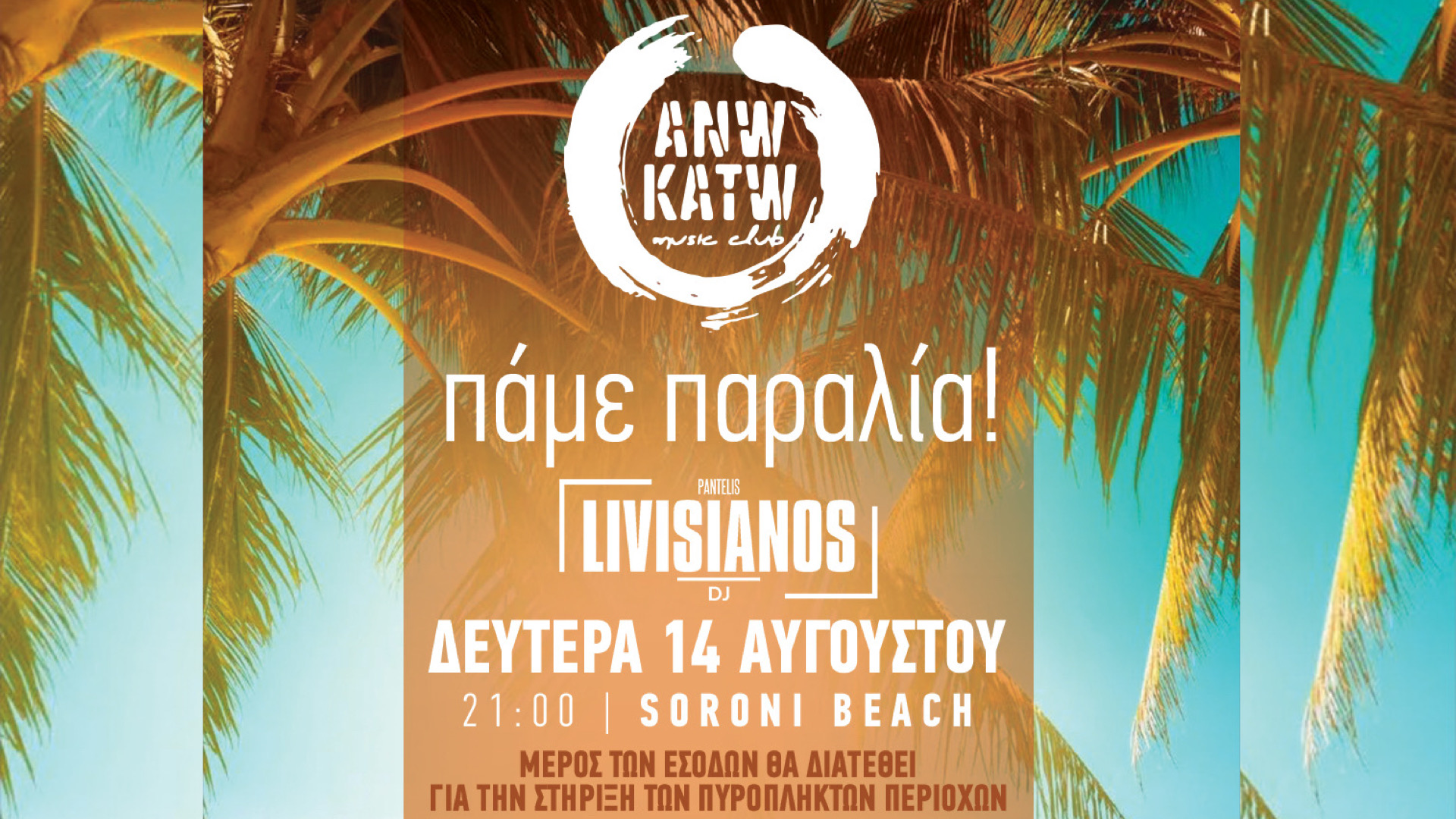 Την Δευτέρα 14 Αυγούστου το Anw Katw μεταφέρεται στην παραλία της Σορωνής για ένα party που σίγουρα θα κάνει την διαφορά.